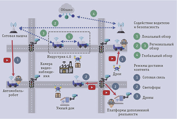 Системы связи 5G позволяют передавать и другие данные. Для координирующего управления автомобилями и дорожным движением понадобится иерархическая система, обеспечивающая контроль на локальном, региональном и глобальном уровнях. На самом нижнем уровне иерархии автомобили-роботы будут самостоятельно принимать решения о движении и планировании маршрутов с учетом данных, полученных от других автомобилей и от периферийных узлов. Принятие решений на уровне отдельных автомобилей будет осуществляться с помощью распределенных алгоритмов на основе консенсуса с целью минимизации рисков. На региональном уровне будут работать ячейки eCell: доступная им информация о состоянии автомобилей, находящихся в регионе, будет использоваться для планирования маршрутов в пределах зоны покрытия ячейки. В частности, eCell смогут предоставлять сведения о местонахождении пешеходов (рис. 2, a) или о встречном дорожном движении (рис. 2, б), недоступные конкретному автомобилю из-за препятствий. В связи с высокой скоростью движения автомобилей и наличием передвигающихся пешеходов, для обеспечения качества управления и координации необходимо, чтобы связь на региональном уровне осуществлялась с минимальной задержкой. На верхнем, общемировом уровне сквозное планирование маршрутов будет производиться в облаке с использованием сведений о движении по дорогам всего мира.