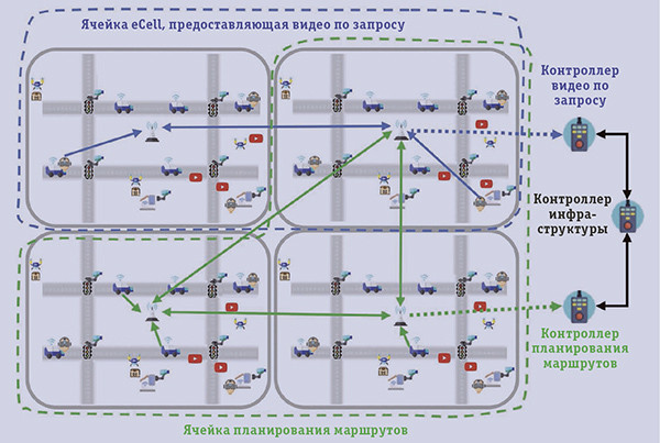 | Рис. 5. Динамические ячейки eCell. Сеть с четырьмя периферийными узлами, динамически сгруппированными в две ячейки (пунктирные линии), одна из которых отвечает за доставку видео по запросу, а другая — за планирование маршрутов. Узлы внутри ячейки объединены и могут распределять нагрузку между собой. Пунктирными линиями со стрелками обозначены метаданные мониторинга производительности, которые отправляются на выделенные контроллеры оркестровки уровня приложений каждой из ячеек |
