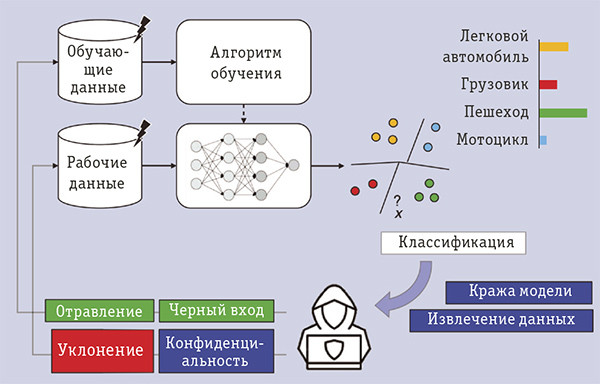 | Основные виды AML-атак. Атаки уклонения и атаки против конфиденциальности готовятся на этапе эксплуатации системы. Они предусматривают манипулирование рабочими данными либо для уклонения от обнаружения, либо для получения конфиденциальных сведений о модели машинного обучения или ее пользователях (например, посредством атаки кражи модели или извлечения данных); при этом для итеративного обновления атакующих выборок обычно требуется обратная связь от модели машинного обучения. Атаки «отравления» и «черного входа» дополнительно требуют от атакующего манипуляций с учебными данными и (или) моделью машинного обучения на этапе ее разработки |