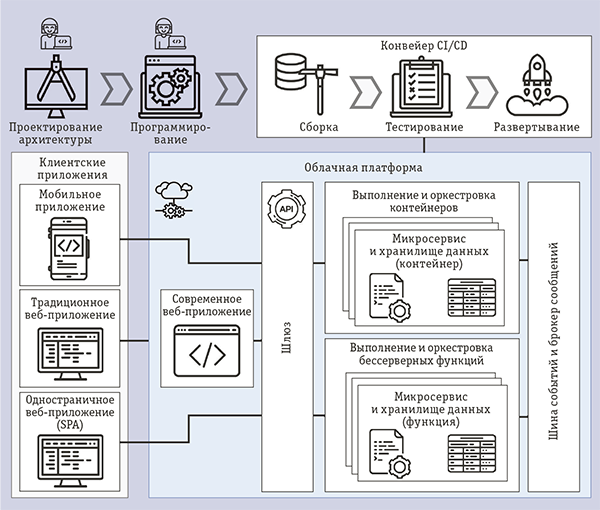 На рис. 1 изображены типичная архитектура облачного приложения и конвейер проектирования, программирования, сборки и развертывания:
