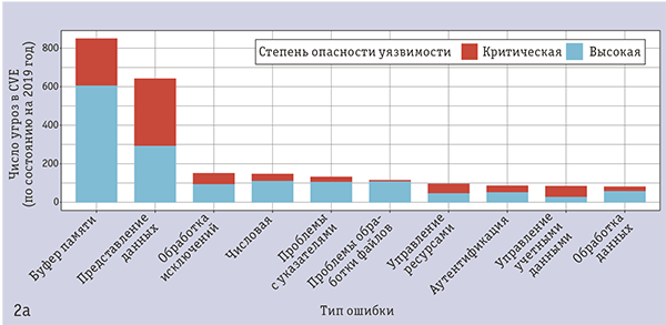 В 2019 году во многих отраслях атаки на веб-приложения вошли в тройку наиболее распространенных [1] — прогнозируется, что к 2025 году 70% атак на контейнеры и выполняемые в них рабочие нагрузки будут осуществляться с использованием известных уязвимостей и ошибок настройки. На рис. 2а можно видеть, что в 2019 году в различных приложениях было обнаружено несколько тысяч критических и опасных брешей безопасности, причем большинство из них связаны с неверной обработкой буферов памяти и представлением данных. Приложения, написанные на интерпретируемых языках, реже подвержены проблемам с буферами памяти, но в таких приложениях часто встречаются ошибки представления данных, открывающие поле для опасных атак межсайтового скриптинга, инъекций и выполнения постороннего кода.
