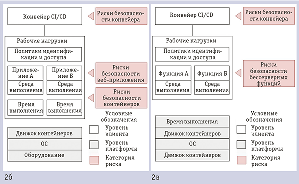 | Рис. 2б. Контейнерная модель поставки облачного приложения и связанные риски безопасности Рис. 2в. Бессерверная модель поставки облачного приложения и связанные риски безопасности |