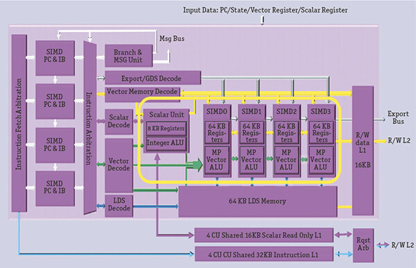 Архитектуры CDNA базировались на архитектуре AMD GCN (Graphics Cores Next), в основе которой — множество вычислительных блоков CU (Сompute Unit) (www.techpowerup.com/gpu-specs/docs/amd-gcn1-architecture.pdf). На рис. 1 и 2 приведена структура такого блока CU в архитектуре GCN [2].