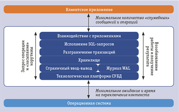 В основе СУБД лежит собственная технологическая платформа — низкоуровневая подсистема, предоставляющая базовые механизмы, позволяющие абстрагироваться от операционной системы и определяющие стиль реализации всех вышестоящих подсистем: ввод-вывод, журнал упреждающей записи, и пр., призванная максимально эффективно использовать современные многоядерные процессоры (рис. 1).