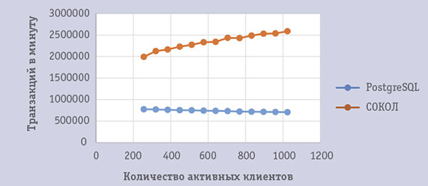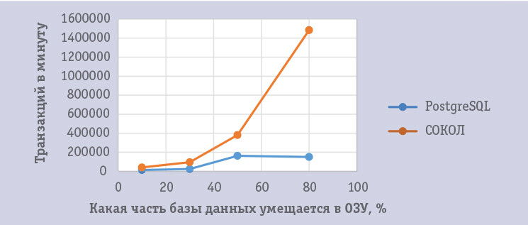 Первое требование к производительности СУБД «ЛИНТЕР СОКОЛ» — эффективная работа в случае, если база данных полностью умещается в оперативной памяти. В этом случае не происходит чтения страниц базы данных, но осуществляется запись модифицированных страниц и журнала WAL. На рис. 2 приведены результаты замеров.