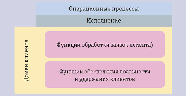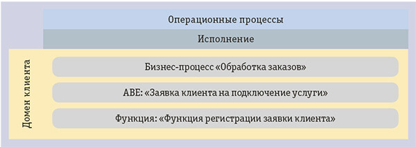 Создание и использование функциональной модели позволяют избегать дублирования функций и выявлять отсутствующие. Домены, используемые в функциональном фреймворке, согласуются с горизонтальными доменами первого уровня фреймворка процессов и информационного фреймворка. На рис. 5 показаны функции первого уровня, лежащие на пересечении вертикального контекста первого уровня «Операционные процессы» и горизонтального домена клиента.