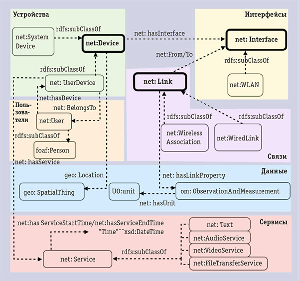 Для построения моделей сегментов сетей обычно используются доменные онтологии предметной области телекоммуникационных сетей (TSDO, ToCo), которые могут дополняться онтологиями уровня приложения, например, может использоваться TNMO, включающая перечни типов элементов сетей с указанием их параметров и позволяющая описывать происходящие в сети события. В качестве примера на рис. 6 показана общая структура доменной онтологии ToCo, которая состоит из следующих модулей: Device (Устройства), Interface (Интерфейсы), Link (Связи), User (Пользоатели), Data (Данные) и Service (Сервисы).