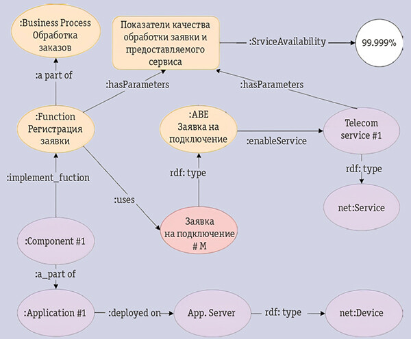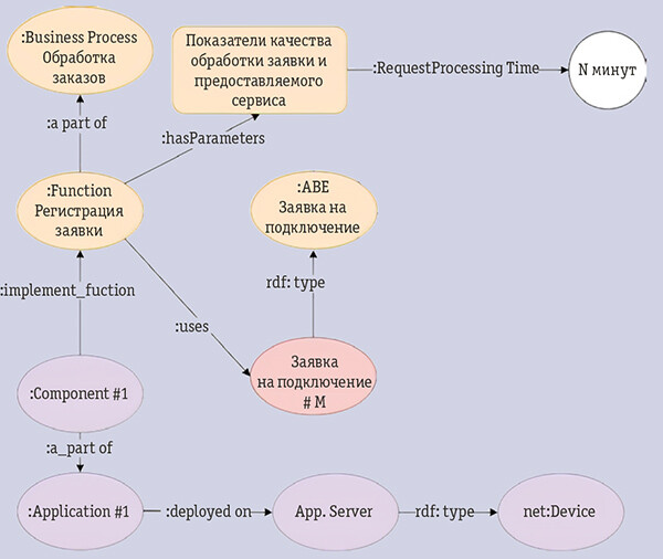 В рамках реализации бизнес-процесса «Обработка заказов» при регистрации и выполнении заявки на подключение телекоммуникационного сервиса на момент создания новой заявки выполняется функция «Регистрация заявки». Данные для заявки размещаются в объекте ABE «Заявка на подключение». Заявка обрабатывается на сервере приложений Application #1 компонентом Component #1. Показатели качества выполнения регистрации заявки определяются в классе онтологии «Показатели качества обработки заявки и предоставляемого сервиса», в рассматриваемом примере показатель — время выполнения, значение N минут (рис. А).