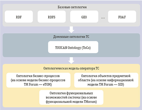 - онтология ToCo (TOUCAN Ontology) — одна из современных онтологий домена телекоммуникационных сетей, позволяющая описывать физическую инфраструктуру сетей, качество каналов связи, услуги и пользователей в разнородных телекоммуникационных сетях [5];