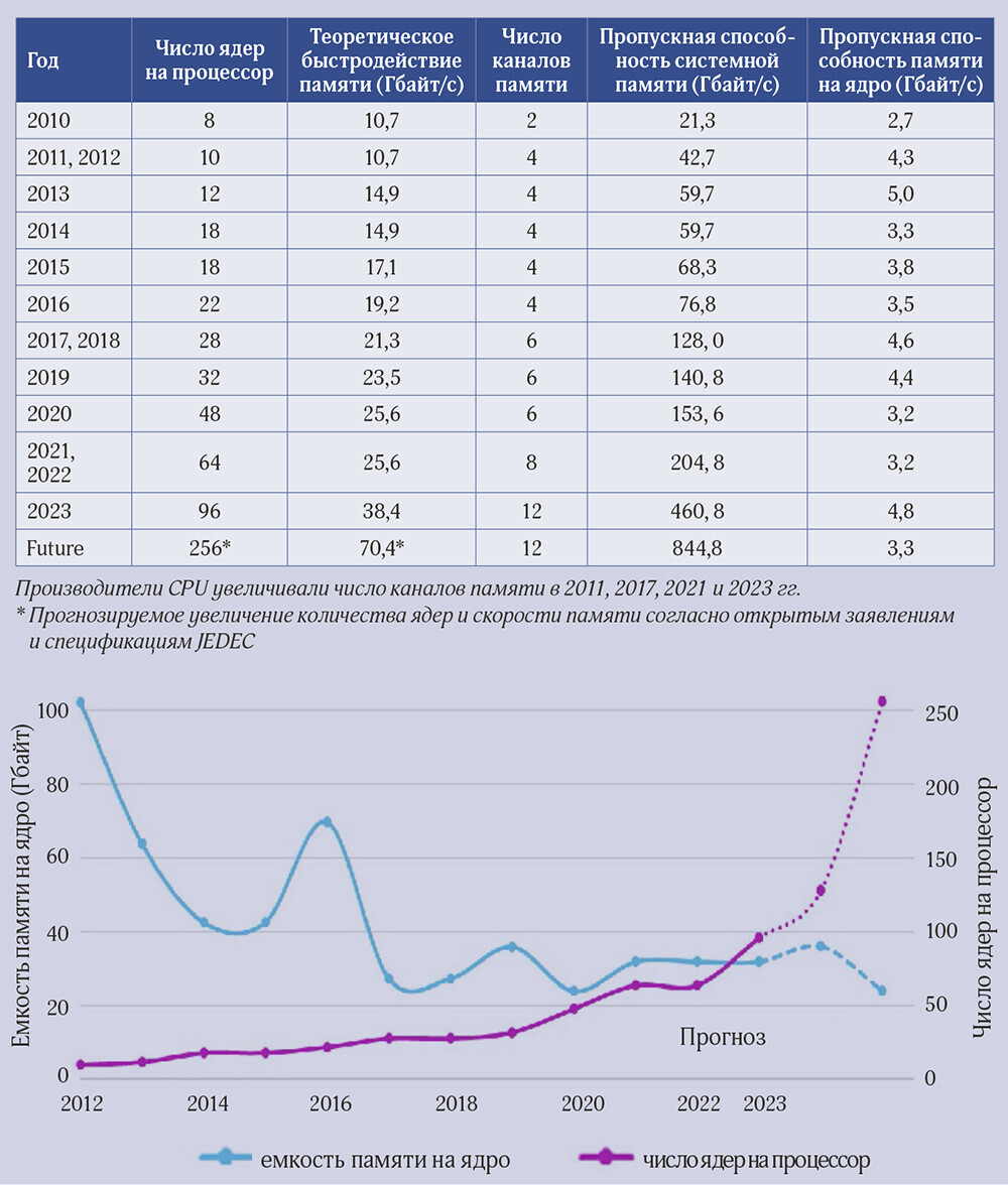 Масштабирование числа ядер в процессорах опережает рост объема памяти на ядро и ее пропускной способности на ядро (рис. 1). Растет и число приложений, связанных с памятью. Производители процессоров пытаются решать эту проблему, увеличивая число каналов памяти на сокет, однако такая реализация достаточно сложна и удорожает процессор [2]. А увеличение объема памяти в варианте 2DPC (два модуля DIMM на канал) уменьшает пропускную способность DDR-памяти. Другие технологии упаковки памяти, например 3D-стекирование, экономически не эффективны [2]. Поддержка масштабируемыми процессорами Xeon 4-го поколения многослойной HBM-памяти (Xeon Max) имела свои ограничения [3] и в следующем поколении этих процессоров не реализована.