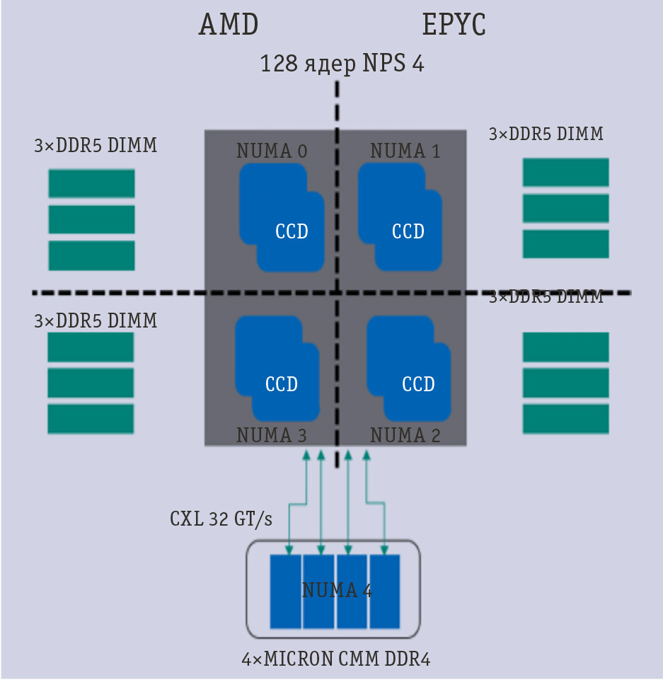 На рис. 3 приведена блок-схема процессора EPYC, где CCD (Core Complex Die) и есть многоядерный кристалл — приведен вариант NPS4, когда в процессоре сформированы четыре домена NUMA и для каждого выделены наиболее близкие и, соответственно, ставшие более высокоскоростными DIMM (хотя все DIMM общие для всех ядер). Аналогично можно сконфигурировать вариант NPS2 с выделением двух доменов или NPS1 с только одним общим доменом памяти на процессор. Память CXL (все четыре CMM) образуют еще один домен NUMA, в котором нет процессорных ядер. Работа с доменами NUMA давно является стандартной возможностью Linux, и эта память CXL не вносит новых особенностей.