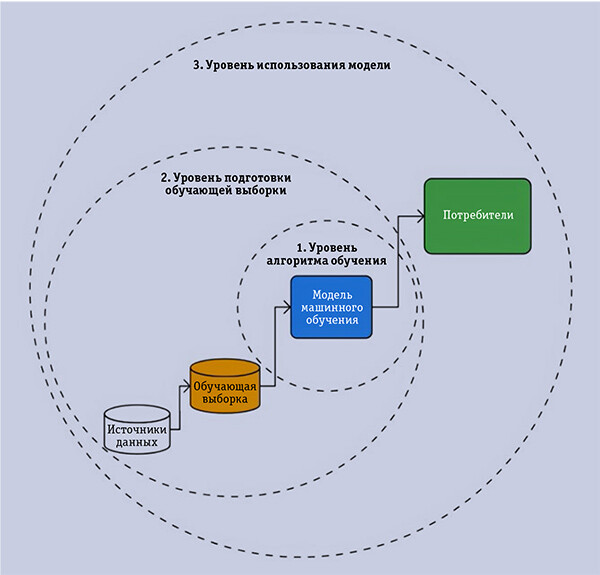 Все эти алгоритмы объединяет то, что сначала модель обучается, а потом используется для решения конкретной задачи, поэтому для системного, риск-ориентированного подхода к тестированию следует разделить его на три уровня (см. рис.): алгоритм обучения; подготовка обучающей выборки и использование модели.