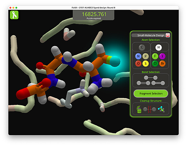 Игра — и научная работа — продолжается. Пользователи имеют возможность брать «цепочки» аминокислот и складывать их в форму, которая позволяет белку выполнять возложенную на него функцию. Примерами белков являются инсулин и гемоглобин. После расширения функционала Foldit поддерживает и небольшие молекулы, не являющиеся белками, в частности, аспирин. Когда исследователь белков сталкивается с определенной проблемой, он может создать для нее задачу в Foldit. Разгадывая пазлы Foldit, вы помогаете тем самым в изучении белков. В настоящее время в списке актуальных задач присутствуют яд утконоса и ген KCNQ1, который кодирует белок, оказывающий влияние на регулирование сердечного ритма.
