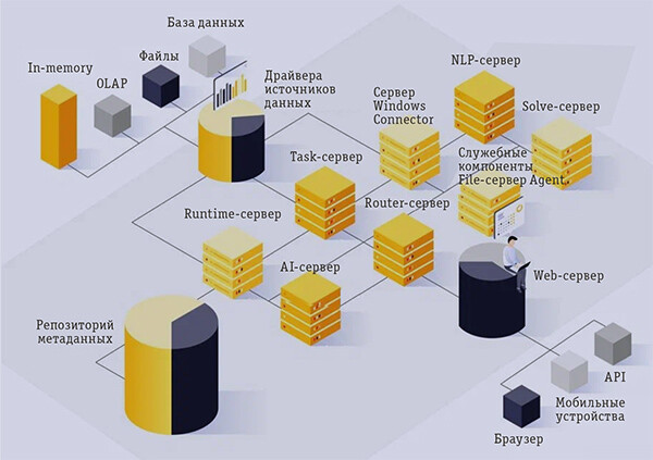 Платформа предлагает функционал, позволяющий как аналитикам, так и конечным пользователям работать с данными в режиме самообслуживания, включая автоматизацию сложных расчетов и поддержку интерактивного взаимодействия с BI-системой. Вся работа ведется через браузер путем обращения к веб-приложениям, покрывающим свой блок функций. Основные компоненты ядра платформы включают (рис. 1): репозиторий метаданных — обеспечивает сохранность и восстановление данных о пользователях и контенте; веб-сервер — точка входа для всех пользователей и запросов; сервер маршрутизации — балансирует нагрузку и направляет запросы между компонентами; сервер запросов — трансформирует визуализации в запросы к данным и выполняет их; сервер задач — обрабатывает задачи процессинга, рассылок и экспорта данных. Имеются также служебные компоненты, напрямую не фигурирующие в работе с пользователем, но предназначенные для решения задач «за кадром»: файловый сервер, агент мониторинга и пр.