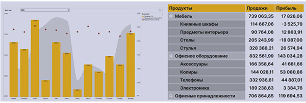 Поддержка комбинированных диаграмм и использование двух осей на одном графике позволяют сравнивать разнородные данные — пользователи могут настраивать собственные визуализации и применять преднастроенную отчетность печати, что упрощает подготовку документов (рис. 2).