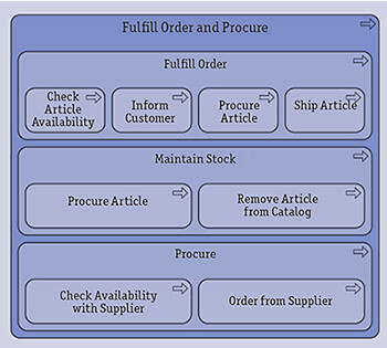 Моделирование процессной иерархии. ArchiMate поддерживает как иерархическую декомпозицию диаграмм, так и вложенность процессов на одной диаграмме (рис. 8). Визуально процессы и группы процессов в ArchiMate не различаются.