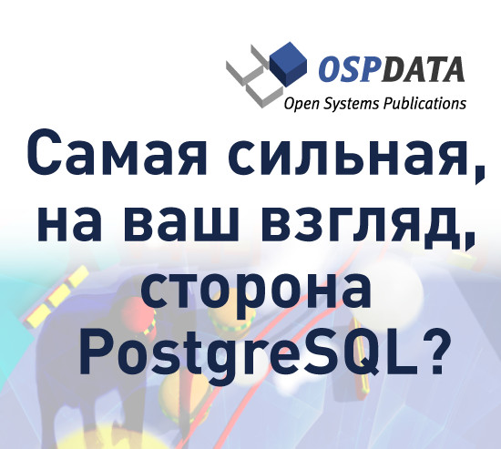 Аналитическая группа OSP Data провела опрос среди участников конференции — было предложено ответить на вопрос: какова самая сильная, на ваш взгляд, сторона PostgreSQL? На вопрос ответили около 200 человек. Больше половины опрашиваемых (57%) отметили технологический потенциал СУБД PostgreSQL. Следующим по значимости (20%) оказалось отсутствие лицензионных отчислений. 15% участников опроса посчитали наиболее важным наличие профессиональной поддержки российского сообщества. И только 8% участников специализированного мероприятия признались, что предпочитают работать с другими СУБД. Кроме этого, некоторые из опрошенных добавили, что успех СУБД PostgreSQL определяют соответствие этой системы требованиям законодательства РФ и ее надежность.