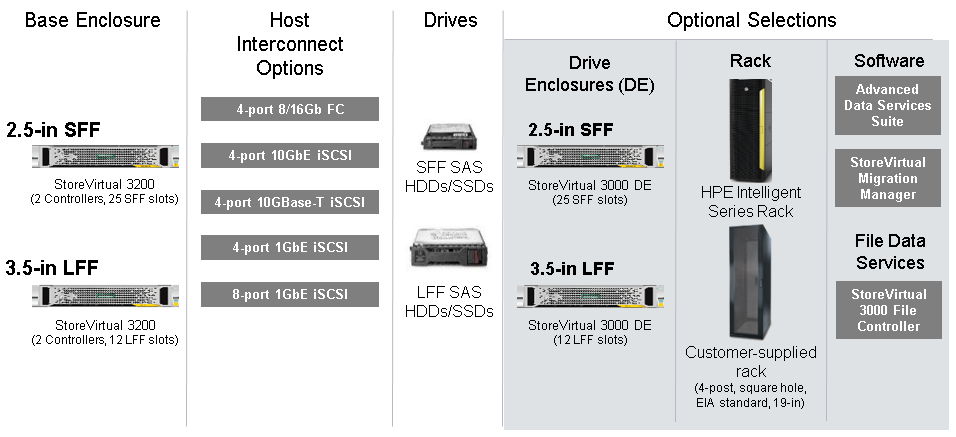 | HPE StoreVirtual 3200 — массив хранения под управлением LeftHand OS, обеспечивающий горизонтальное масштабирование при низкой стоимости размещения данных. |
