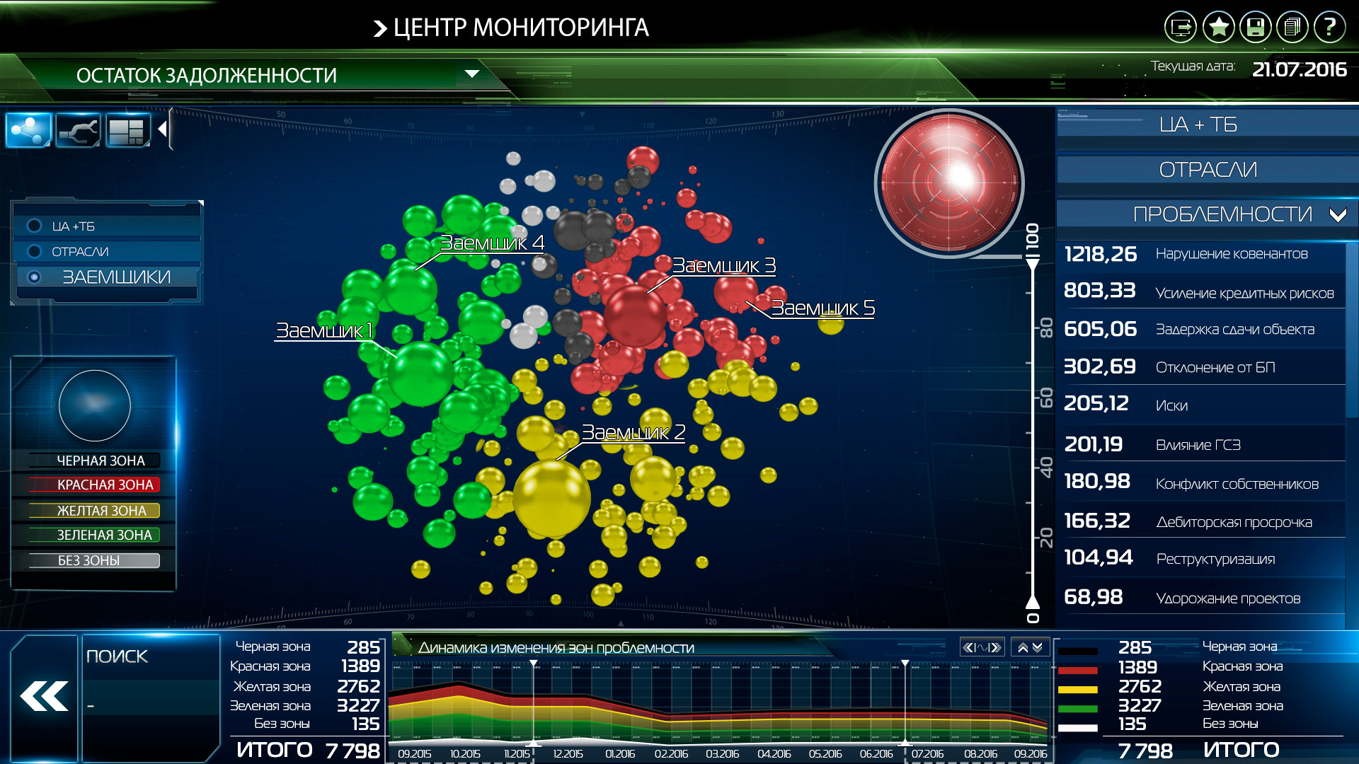 Идея заключается в следующем. Большое количество данных очень сложно воспринять: информацию нужно прочитать, осмыслить, представить в понятных терминах, затем поразмыслить над ситуацией и принять решение. Вся эта цепочка занимает немало времени и сил. В игровых сценариях все намного проще: взаимодействуя с трехмерной моделью, наглядно отражающей работу организации или какой-то процесс, руководитель очень быстро, в некоторых случаях буквально за считанные секунды, может оценить ситуацию и увидеть проблемные зоны. При этом на одном экране размещается в разы больше информации, чем при использовании традиционных средств визуализации. Например, если какой-то участок имеет окраску тревожного красного цвета или выразительный игровой персонаж (например, рассерженный человек в очереди) иллюстрирует негативный статус определенного процесса, значит, там есть проблемы. Можно одним движением пальцев приблизить эту зону, детализировать и быстро разобраться в причинах отклонений. При этом восприятие информации, ее интерпретация, осуществляется пользователем на интуитивном уровне. Этот эффект еще дополняется возможностью «мультитач» — взаимодействием с сенсорным интерфейсом. Такой подход позволяет фактически «погрузить» пользователя в его проблемную среду и существенно сократить время, необходимое для принятия управленческого решения.