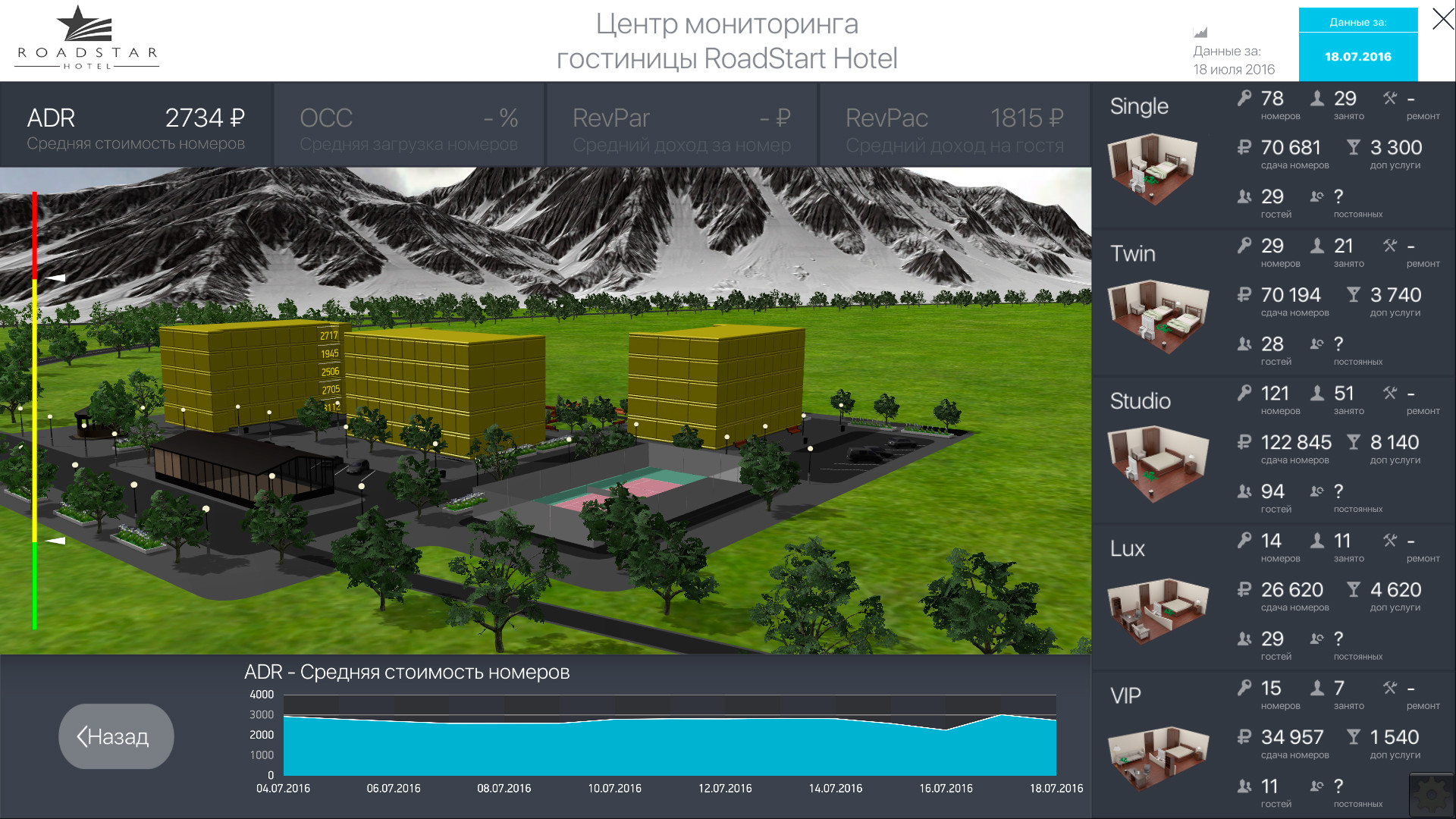 Для заказчика, который занимается гостиничным бизнесом, мы создали трехмерную динамическую модель отеля, с помощью которой его менеджеры могут получать интегрированную оценку эффективности не только каждого номера, но и всех типов номеров сразу по следующим показателям: стоимость и загруженность номера, доход на гостя. Данные выводятся как на текущий момент, так и в ретроспективе, что позволяет увидеть динамику изменений и картину в целом.