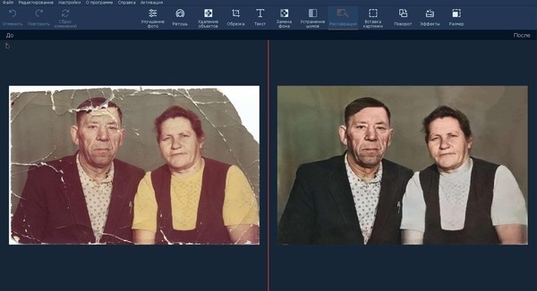 Процесс восстановления старых фотографий в редакторе Movavi 6.0 проходит в несколько этапов. После открытия программы нужно перейти в отдел «Реставрация», выбрать необходимые опции и нажать кнопку «Реставрировать». В зависимости от размера и разрешения изображения процесс может длиться от нескольких секунд до десяти минут. При наличии мелких дефектов после реставрации (такое может быть — ведь программа постоянно находится в процессе обучения) нужно перейти во вкладку «Удаление объектов» и завершить работу с помощью инструментов «Штамп» или «Кисть». При желании можно выполнить цветокоррекцию в разделе «Улучшение фото» и уменьшить зернистость изображения в разделе «Устранение шумов». Скачать приложение можно по ссылке https://www.movavi.ru/photo-editor/.