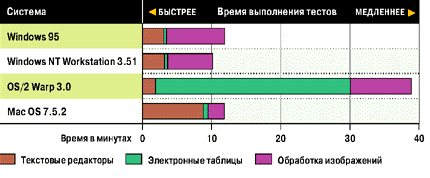 Испытания Windows 95, Windows NT Workstation 3.51 и OS/2 Warp 3.0 проводились на ПК фирмы Hewlett-Packard с 90-МГц процессором Pentium, 16-Мбайт ОЗУ, кэш-памятью второго уровня емкостью 256 Кбайт, жестким диском емкостью 950 Мбайт и встроенным видеоадаптером. Испытания Mac OS 7.5.2 выполнялись на Power Macintosh 7500 с 100-МГц процессором PowerPC 601, 24-Мбайт ОЗУ, дисковым кэшем емкостью 96 Кбайт, жестким диском емкостью 700 Мбайт и встроенным видеоадаптером. Для всех ОС использовались исходные настройки дискового кэша и виртуальной памяти. В тестах на быстродействие в 32-разрядном режиме использовались программы, обычно применяемые при решении деловых задач (текстовый процессор, электронная таблица и программы обработки изображений). Для каждой ОС существует своя программа, результаты этих тестов отражают быстродействие не только самой программы, но и ОС. Windows 95, Windows NT и OS/2 Warp также тестировались на быстродействие в 16-разрядном режиме путем выполнения типовых задач с помощью трех пакетов для Windows: WordPerfect 6.1, Excel 5.0 и Picture Publisher 5.0.