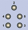 Вид MIDI-разъема со стороны соединения. Контакты 4 и 5 - сигнальные, контакт 2 - экранный. Полярность сигналов указывается относительно источника тока: контакт 4 - плюс, контакт 5 - минус. (Все обозначения приведены для разъемов Out и Thru, для разъема In назначение контактов обратное.)