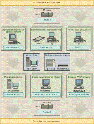 НЭБ — информационная система, отличающаяся не только объемом хранимой или вводимой информации, но и многообразием ее обработки. Что же происходит за дверями библиотеки? Сотрудники НЭБ по электрическим каналам связи и по почте принимают от поставщиков информацию, которую затем сканируют, распознают, автоматически вводят и обрабатывают, а тексты изданий в неэлектронном виде набирают вручную. В их функции входят также архивирование и складирование документов, управление средствами поиска, отправка заказанной информации пользователям. Сотрудники маркетинговой службы работают с внешними WWW-серверами, ведут аналитическую обработку материалов, создавая качественно новую информацию, и проводят бухгалтерские расчеты.