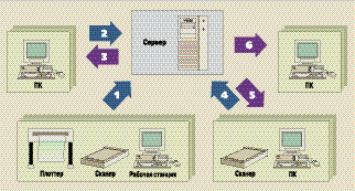 Рассмотрим, каким образом сотрудники библиотеки выполняют ввод и первичную обработку изданий (рис. 2). Для ввода и сегментирования информации в структуре цеха имеются рабочие места (рис. 2, поз. 1), оснащенные ПК (или рабочими станциями) с подключенными к ним плоттерами и сканерами. Редактирование после распознавания сегментов производится на других рабочих местах только с ПК (на рис. 2, поз. 2 и 3). При необходимости дополнительно производится ввод плохо распознанных сегментов с рабочих мест со сканерами (рис. 2, поз. 4 и 5). В завершение производится верификация результатов предыдущих действий (рис. 2, поз. 6).