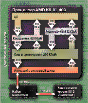 На уровне битов и байтов K6-III радикально не отличается от своего предшественника K6-2. Важным нововведением стало то, что компания AMD разместила 256 Кбайт кэш-память второго уровня непосредственно на кристалле K6-III. В результате кэш работает на той же частоте, что и ядро процессора, а не на половинной, как это происходит с вынесенным за пределы кристалла кэшем процессоров Pentium II и Pentium III. У K6-2 кэш-память второго уровня функционирует на частоте 100 МГц.