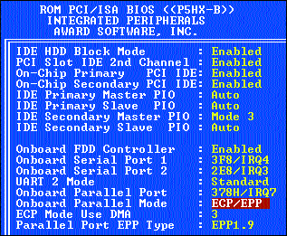 Включите ПК и войдите в программу установки начальной загрузки компьютера (BIOS). Убедитесь, что параллельный порт компьютера работает в режиме EPP (Enhanced Parallel Port — порт с улучшенными возможностями) или, что предпочтительней, в режиме ECP (Extended Capabilities Port — порт с расширенными возможностями). Для многих машин программа конфигурации BIOS (А) позволяет использовать комбинацию режимов ECP/EPP, и это идеал. Выключите ПК. Если к параллельному порту подключен принтер или другое устройство, отсоедините от него кабель. Один конец кабеля для передачи данных, входящего в комплект поставки дисковода CD-RW, подключите к параллельному порту ПК, а другой — к расположенному на задней части корпуса накопителя CD-RW (В) разъему.