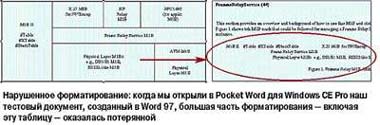 Большинству пользователей карманных ПК придется регулярно конвертировать файлы для обмена информацией с обычными компьютерами (с помощью прилагаемого ПО для Windows CE). Следует иметь в виду, что при конвертировании некоторые данные безвозвратно теряются. Такая участь ожидает макросы, фильтры данных и диаграммы из электронных таблиц. Наш тестовый документ, содержащий сложное форматирование, после преобразования также потребовал немало работы по восстановлению утраченного: таблицы потеряли выравнивание, уменьшенные прописные буквы стали строчными, а сноски и вовсе пропали.
