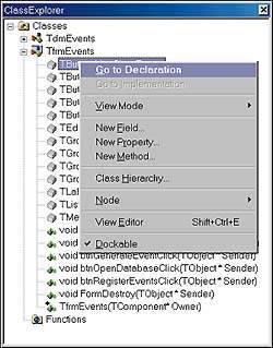 Перемещение между объектами внутри модуля осуществляется двойным щелчком мыши на имени объекта в ClassExplorer. Можно также выбрать пункт Go to Declaration в контекстном меню выбранного метода или переменной. В длинных листингах без такого рода помощи пришлось бы весьма тяжело.
