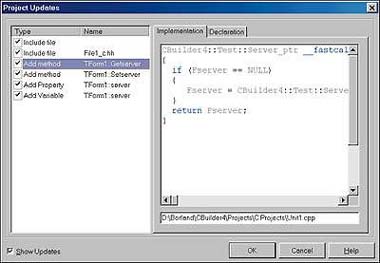 Одновременно серверный исходный текст обновляется так, чтобы создавался экземпляр объекта. Если включить опцию Show Updates, то в дальнейшем вы сможете отслеживать все изменения, произошедшие в проекте, если обратитесь к команде CORBA Refresh (рис. 10).