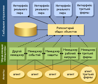 - глобального отображения (World View), включающего в себя интерфейс (Real World Interface), а также репозитарий общих объектов (Common Object Repository);