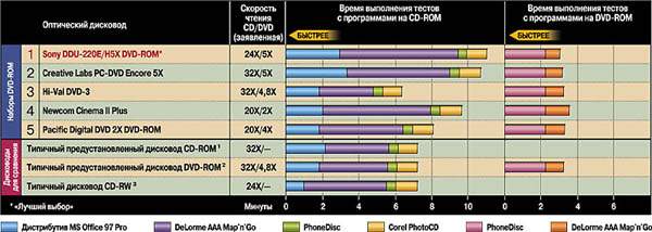 О тестировании. Дисководы тестировались на скорость чтения с помощью набора сценариев, выполняющих наиболее распространенные задачи: четыре — при чтении CD-ROM и две — при чтении DVD-ROM. Измерялось время полного завершения дисководами каждого сценария. В тестах с CD-ROM определялось время копирования инсталляционных файлов пакета Microsoft Office 97 Professional, создания дорожного маршрута в программе DeLorme AAA Map?n?Go, поиска 47 номеров на диске PhoneDisc и вывода на экран 100 фотографий с диска Corel PhotoCD. В тестах с DVD-ROM повторялись контрольные задачи с DVD-версиями пакетов DeLorme и PhoneDisc. Все дисководы тестировались в среде Windows 98 на машине Dell Dimension