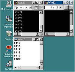 | Рис. 2. Фрагмент экрана Windows 95 с окнами бесконечных процессов: окна c черным фоном — модули win32, с белым — win16; окна со столбцом чисел — программы а, пустое окно — программа б |