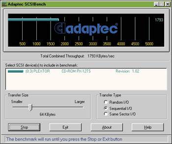 Программа SCSI bench32 поможет определить (total combinied throughput) скорость чтения данных всеми SCSI-устройствами, подключенными на данный момент к ПК. Возможно изменение размера передаваемого блока и выбор трех режимов измерения: