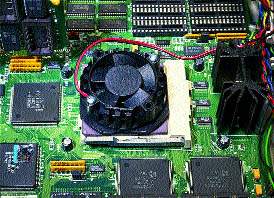 2 Установите новый Pentium II. Выньте процессор из защитной упаковки и вставьте картридж в рамку. Затем аккуратно надавите на него, чтобы расположенные с каждой стороны рычажки защелкнулись на рамке. Проверьте, надежно ли установлен новый процессор. Подключите кабель питания вентилятора к системной плате.