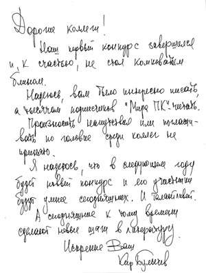 И все-таки объявлен был литературный конкурс, хотя и в рамках определенного жанра. Фантазия от фантастики тем и отличается, что если первая — свободный полет мысли, то вторая — тот же полет, но оформленный литературно. Поэтому наша главная премия достанется одаренной, хотя и начинающей сочинительнице Е. Родиной за цикл рассказов «Геном». В одном из них даже ошибка в программе не разрушает мир, а наоборот — соединяет людей.