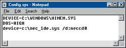 - Вернитесь в Блокнот и откройте находящийся на диске С: файл config.sys. Найдите строку, содержащую команду и начинающуюся с device=, а также где-нибудь далее в ней символы «cd» (как правило, они принадлежат драйверу дисковода CD-ROM). Удалите из файла все другие строки, а саму команду подправьте. Например, если она выглядит как device= c: ec_ide.sys /d:neccd0», то сократите ее до device=nec_ide.sys /d:neccd0.