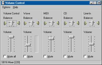 Устанавливать баланс между левой и правой колонкой в домашней стереосистеме совсем просто, а как обстоят дела со стереосистемой вашего ПК? В Windows 95 есть возможность управлять балансом звука, но найти соответствующий регулятор не так-то просто. Нажмите кнопку «Пуск» (Start) и выберите пункты «Программы?Стандартные?Мультимедиа?Регулятор громкости» (Programs?Accessories?Multimedia? Volume Control). Появится диалоговое окно, с помощью которого можно устанавливать громкость и баланс звука системы воспроизведения, так же как специфичных wav- и аудиофайлов звуковых компакт-дисков.