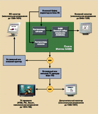 Однако вернемся на твердую почву. Стоило Microsoft объявить о реализации «мультимониторного режима» в ОС Windows 98, как производители видеоплат тут же подхватили ее начинание справедливо полагая, что был бы повод предложен, а уж потребитель под такое решение точно найдется. Matrox одной из первых обнародовала поддержку своими платами «дисплеев на конвейере». В G400 эта технология скрыта в названии DualHead Display. С ее помощью плата способна выводить два независимых видеосигнала на два различных устройства отображения информации. Все это стало возможным благодаря двум раздельным контроллерам, один из которых по традиции отвечает за основной сигнал, а другой взаимодействует по выбору либо с MGA-TVO (высококачественным TV-декодером от Matrox с поддержкой систем NTSC, PAL и SECAM), либо с DFP-интерфейсом. Остается лишь выбрать оптимальный вариант подключения тех или иных дисплеев сообразно своим задачам. Комбинации могут быть самыми различными — от двух стандартных ЭЛТ-мониторов до связки монитор—телевизор или ШК-панель.