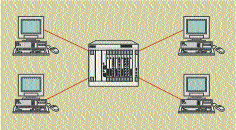 В сети с топологией «звезда» все ПК подсоединяются с помощью кабеля к центральному узлу, называемому концентратором (Hub). Через него сигналы от передающего ПК поступают ко всем остальным. Преимущество такой топологии в том, что если в сети выйдет из строя один компьютер (или соединяющий его с концентратором кабель), то все остальные смогут продолжать обмениваться данными. Кроме того, наличие концентратора позволяет ускорить передачу данных по сети (особенно если он активный) и упростить процедуру ее изменения или расширения. А некоторые типы концентраторов позволяют контролировать работоспособность сети и интенсивность прохождения информации. К недостаткам подобной топологии относится большой расход кабеля, а также то, что при выходе из строя самого концентратора работа во всей сети останавливается. В настоящее время благодаря столь существенным преимуществам такая топология становится все более популярной.