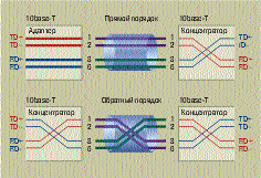 Во время монтажа витой пары будьте внимательны: при соединении концентратора с концентратором кабели к обеим вилкам должны быть подключены одинаково — в прямом порядке. В тех редких случаях, когда витая пара соединяет два компьютера, провода должны подключаться зеркально — в обратном порядке.
