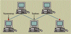 В сети с топологией «шина» данные по кабелю адресуются конкретному ПК, адрес которого соответствует зашифрованному в электрических сигналах. Причем передачу может вести только один компьютер. Так как данные в каждый момент времени могут передаваться лишь одним ПК, производительность сети зависит от числа компьютеров, подключенных к шине. Эта топология является пассивной, т. е. при прохождении через ПК данных, не предназначенных для них, последние не оказывают на информацию никакого воздействия. Если один из компьютеров выйдет из строя, то на работе остальных это также не скажется (трудности могут возникнуть лишь при обрыве кабеля). Однако в сети с такой топологией возникает одна проблема: сигнал, достигнув конца кабеля, отражается и не позволяет передавать данные другим ПК. Чтобы предотвратить это, необходимо устанавливать на концах кабеля для «поглощения» сигнала специальные заглушки — терминаторы. Итак, концы сетевого кабеля должны быть подключены к сетевой плате, BNC-разъему либо к другому оборудованию, например репитеру. Последний соединяет два отрезка кабеля и усиливает сигнал. С его помощью можно передавать данные на большие расстояния.