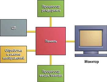Конкуренция между массой производителей подсистем дала главную составляющую успеха — доступность. Это позволило закрыть глаза на многие недостатки архитектуры. Ведь мы знаем, что только процессор и память находятся на одной системной шине, а все остальные устройства общаются с ними посредством общей магистрали обмена данными (рис. 1). Но законы природы неумолимы: за все надо платить. За универсальность — ухудшением характеристик. Шина — это одноколейная дорога, которой могут пользоваться все, кому не лень. Она всегда была, да и сейчас остается одним из узких мест процесса обработки информации. Кроме того, почти каждое внешнее устройство здесь имеет свою буферную память, которая не может быть востребована ни процессором, ни другими подсистемами. Это приводит к непроизводительному копированию больших объемов информации и нерациональному использованию аппаратных ресурсов. Каждый, кто программировал вывод графических изображений на экран ПК, знает, что основное время тратится не на вычисления, а на пересылку данных в графическую память. Но при создании IBM PC об этом почти не задумывались. Компьютеры имели исключительно «текстовый» интерфейс, и никто не мог себе даже представить, что когда-нибудь придется обрабатывать такие огромные объемы графической информации, какие сейчас, например, требуются для вывода на экран «живого» видео.