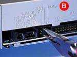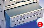 Подключите DVD-дисковод. Современные системные платы имеют первичный и вторичный IDE-каналы, каждый со своим собственным разъемом (А). Один кабель подключает жесткий диск к первичному, а другой, как правило, привод CD-ROM — к вторичному каналу. Каждый из них может поддерживать два устройства, и если это возможно, то подключите DVD-дисковод к тому кабелю, к которому подсоединен привод CD-ROM. Если этот разъем занят другим устройством, например накопителем на магнитной ленте или дисководом Zip, подключите DVD-дисковод к кабелю, соединяющему системную плату и жесткий диск. Конечно, это возможно только тогда, когда один из IDE-кабелей имеет три разъема. В противном случае используйте кабель, входящий в комплект поставки DVD-дисковода. Убедитесь, что перемычка, расположенная на задней стороне DVD-дисковода, установлена в положение «slave» (В). Если для помещения дисковода в ПК необходимы салазки (например, при установке 3,5-дюймового дисковода в 5,25-дюймовый отсек), установите их. Вставьте DVD-дисковод в отсек (С) и подсоедините к дисководу кабели IDE и питания (D). Проверьте, подсоединен ли цветной проводник (обычно красного цвета) IDE-кабеля к первому контакту разъема DVD-дисковода (учтите, он маркирован).