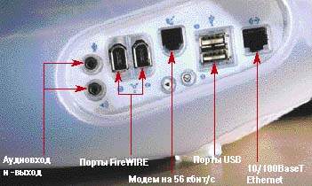 Впрочем, в новые iMac также входит модем стандарта V.90 на 56 кбит/с и сетевой адаптер 10/ 100BaseT Ethernet, как это было в предыдущих моделях. Оба порта расположены на боковой панели iMac, куда выведены порты USB и FireWire.