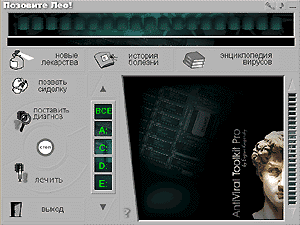 Таким образом, в распоряжение владельца диска поступает профессиональный вариант AVP Касперского для Windows 95/98/NT. Что такое AVP? Это антивирусный комплекс, стабильно занимающий по проводимому журналом Virus Bulletin международному рейтингу одно из мест в первой пятерке антивирусных компьютерных средств (http://www.avp.ru). Отличие программы «Позовите Лео!» от AVP в том, что ее пользователи не получают антивирусной поддержки для сети и гарантии вылечить свой ПК за 24 ч в случае заражения чем-то неизвестным. Тем не менее «новые лекарства», как заявляет издатель, по мере их создания становятся доступными в Internet или появляются на дискетах, которые вы сможете получить у фирмы-продавца в течение года.
